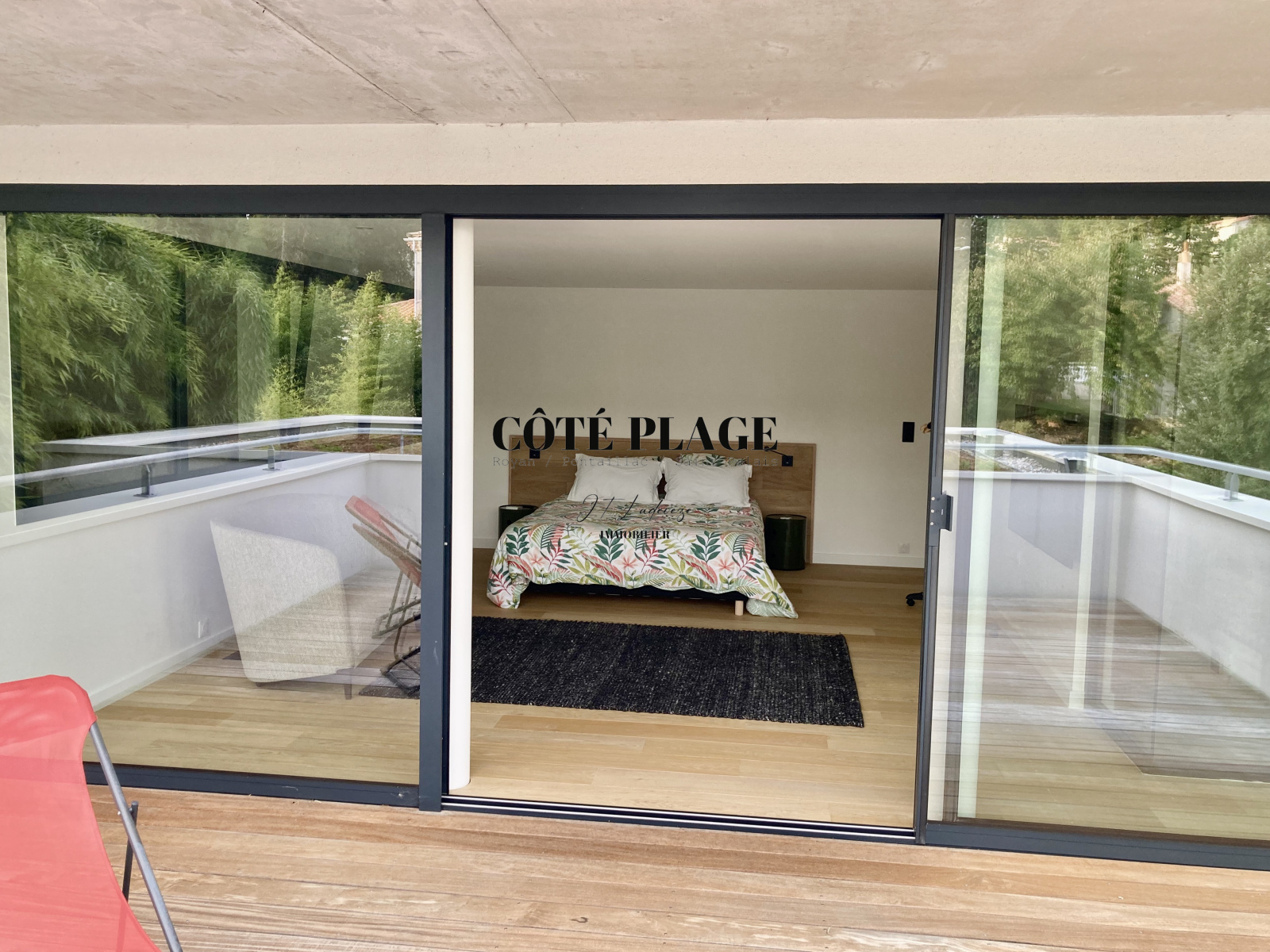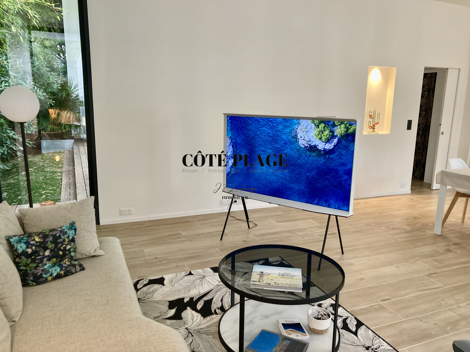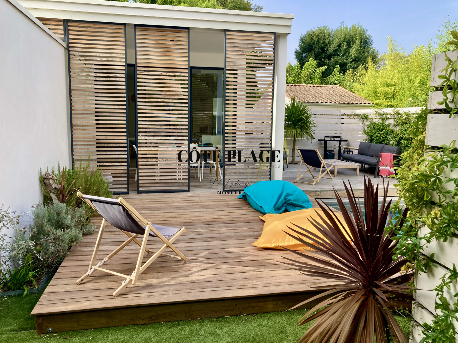 Venez profiter de l’arrière-saison en bord de mer et découvrir la Villa 26, dans le quartier de Pontaillac, magnifique villa d’architecte neuve, lumineuse et de beaux volumes qui bénéficie d’un emplacement idéal: au calme d’une impasse et à 500 mètres de la plage de Pontaillac. Elle se trouve également à proximité d’un superbe parc arboré. Sa piscine chauffée et sécurisée et sa terrasse agréablement végétalisée vous procureront sérénité et détente. La villa présente un salon séjour avec cuisine ouverte tout équipée, très lumineux grâce aux nombreuses baies vitrées. La terrasse attenante est en partie couverte et donne directement sur la piscine. Deux des chambres sont au rez-de-chaussée, dont une avec salle d’eau. La 3e chambre est à l’étage, bénéficiant d’une terrasse et d’une vue dégagée. La salle d’eau principale, au rez-de-chaussée, présente une belle et grande douche à l’italienne.
