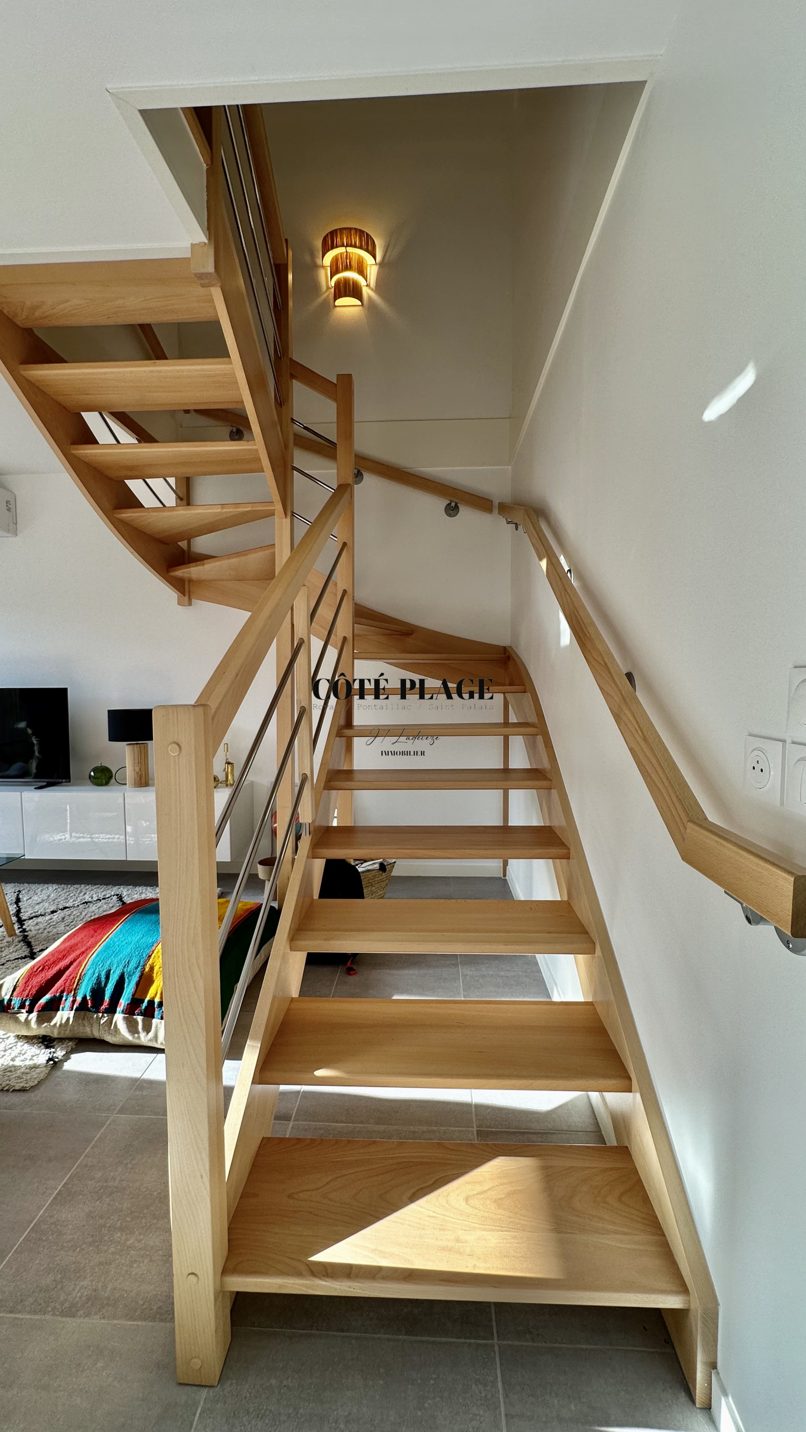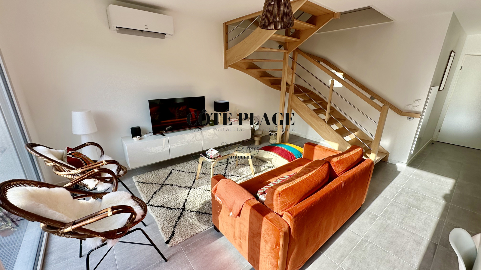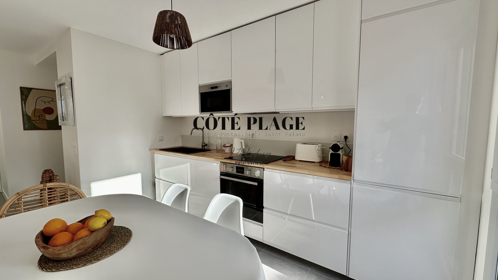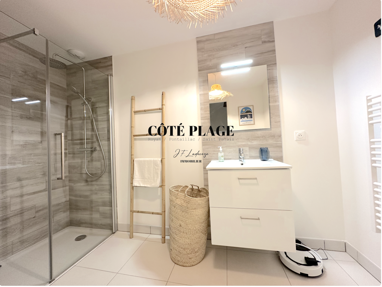 COTÉ PLAGE IMMOBILIER vous présente à la location de vacances une maison à étage neuve d'environ 89 m2 avec 4/6 couchages composé d'une entrée , d' un salon/séjour avec cuisine neuve entièrement équipée et aménagée ouvrant sur une terrasse et jardinet, salle de bains avec toilettes, à l'etage supérieur : un dégagement desservant 3 chambres (2 lits 160cm + 1 lit 140cm) avec rangement , salle d'eau , wc - une place de parking privative -