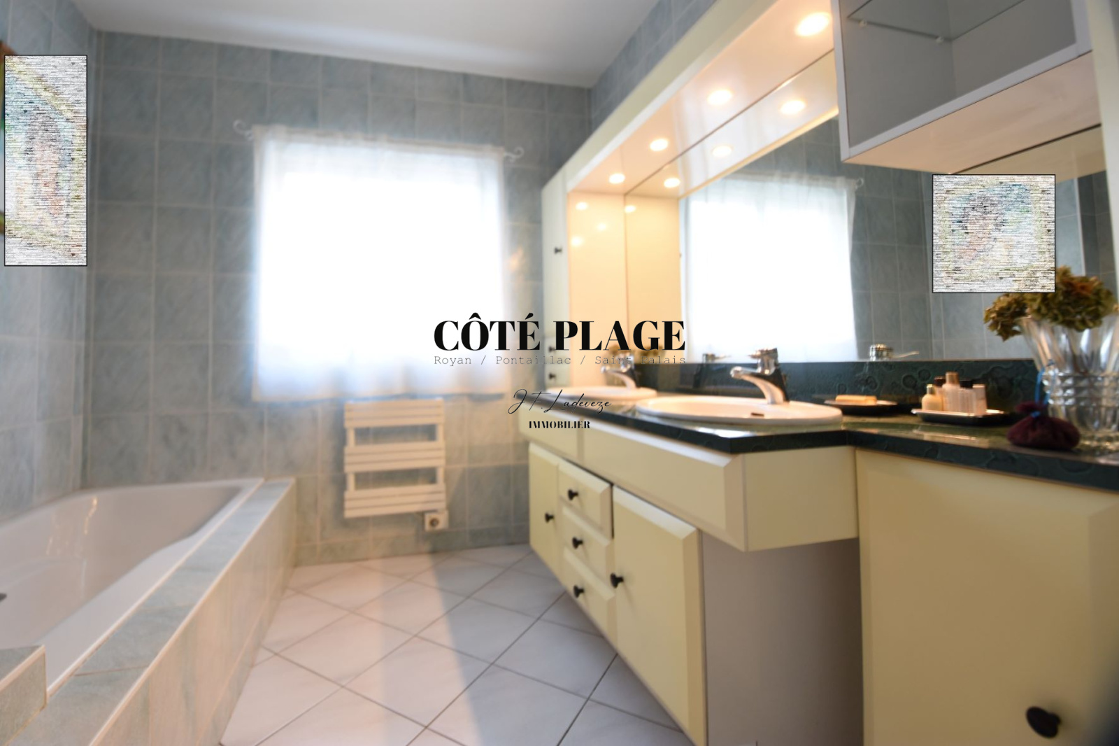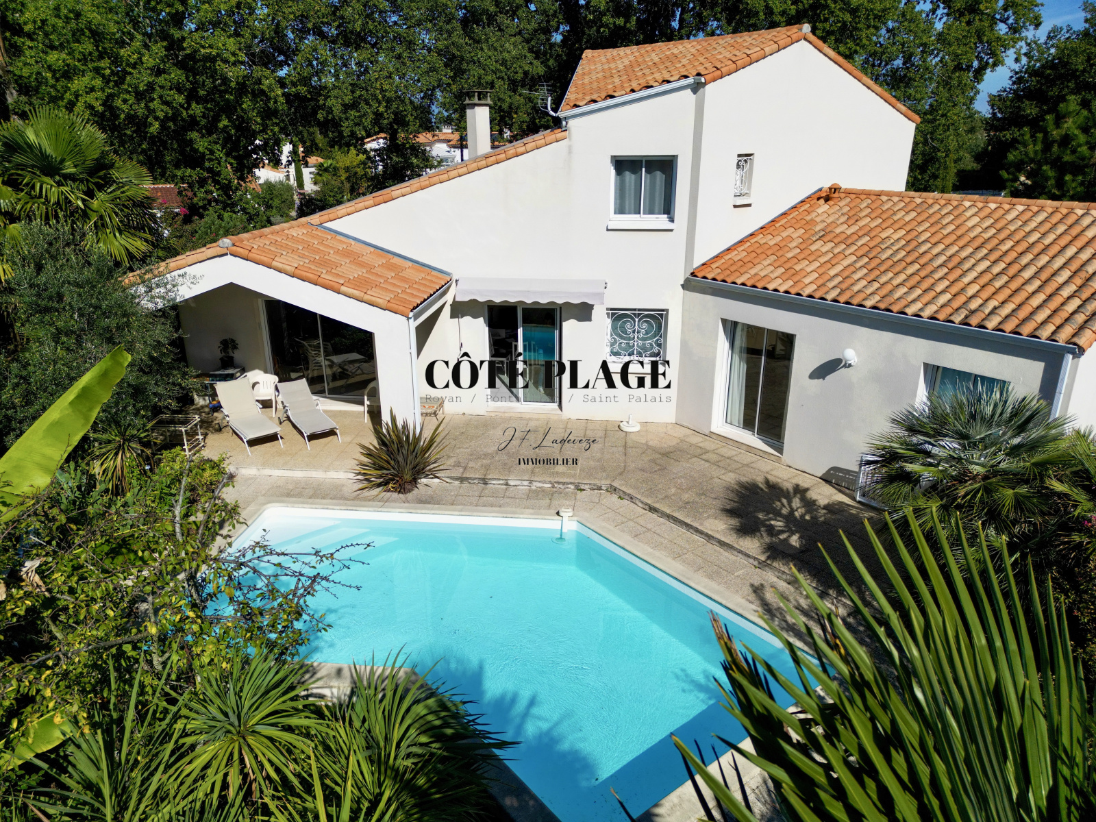 CÔTÉ PLAGE IMMOBILIER ROYAN PONTAILLAC vous présente à la vente cette très belle villa noyée dans un écrin de verdure, dotée d'une surface de 203 m2 environ sur 2 niveaux et composée de la manière suivante : VASTE ENTRÉE / GRAND SALON SÉJOUR AVEC CHEMINÉE / CUISINEE ÉQUIPÉE / 4 CHAMBRES / BUREAU / 2 SALLES D'EAU / SALLE DE BAINS / BUANDERIE / PISCINE / GARAGE DOUBLE COMMUNIQUANT / 2 PIÈCES DÉPENDANTES / CAVE / PLUSIEURS VASTES TERRASSES . Villa édifiée sur un terrain de 832 m2 arboré et agréablement paysagé .