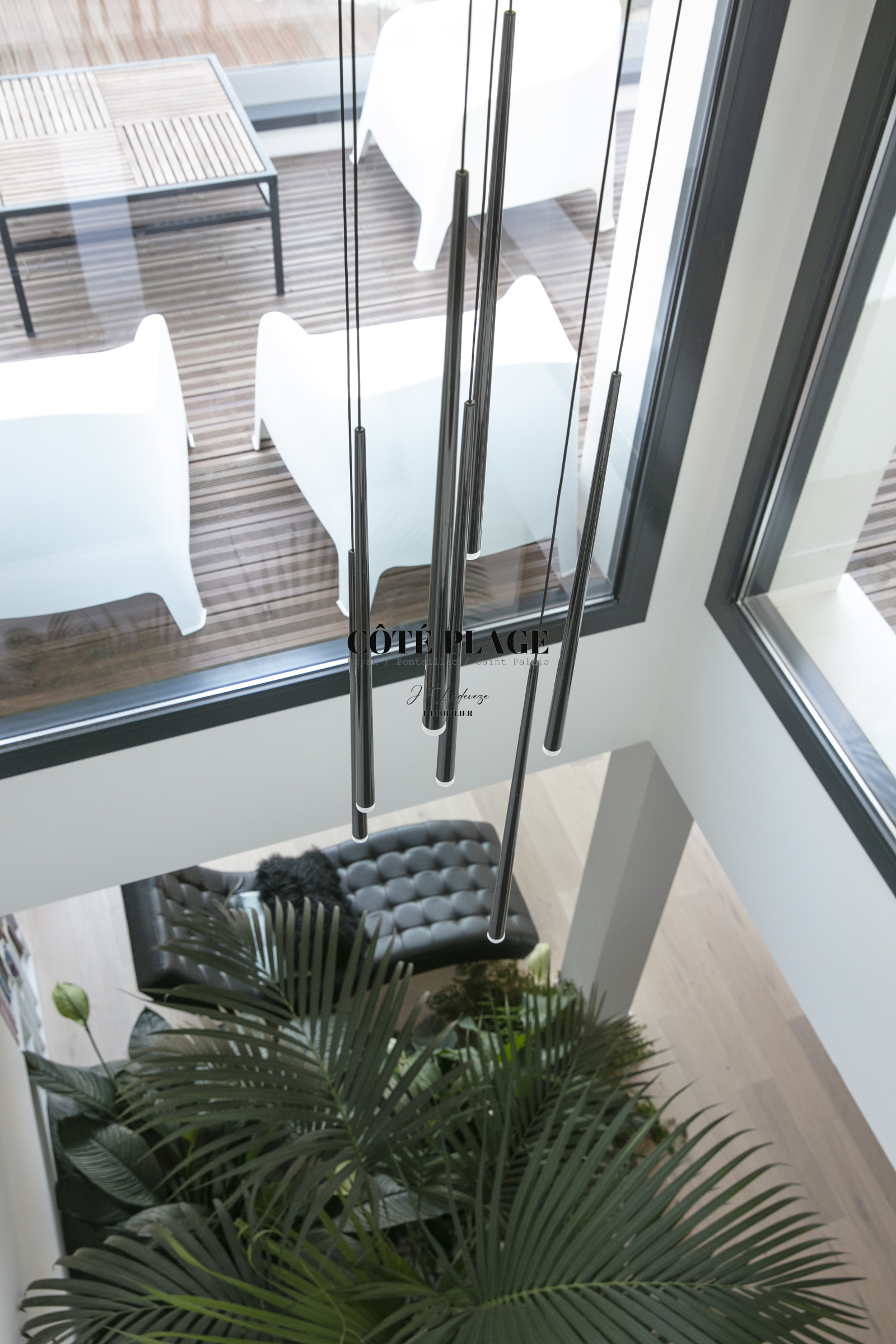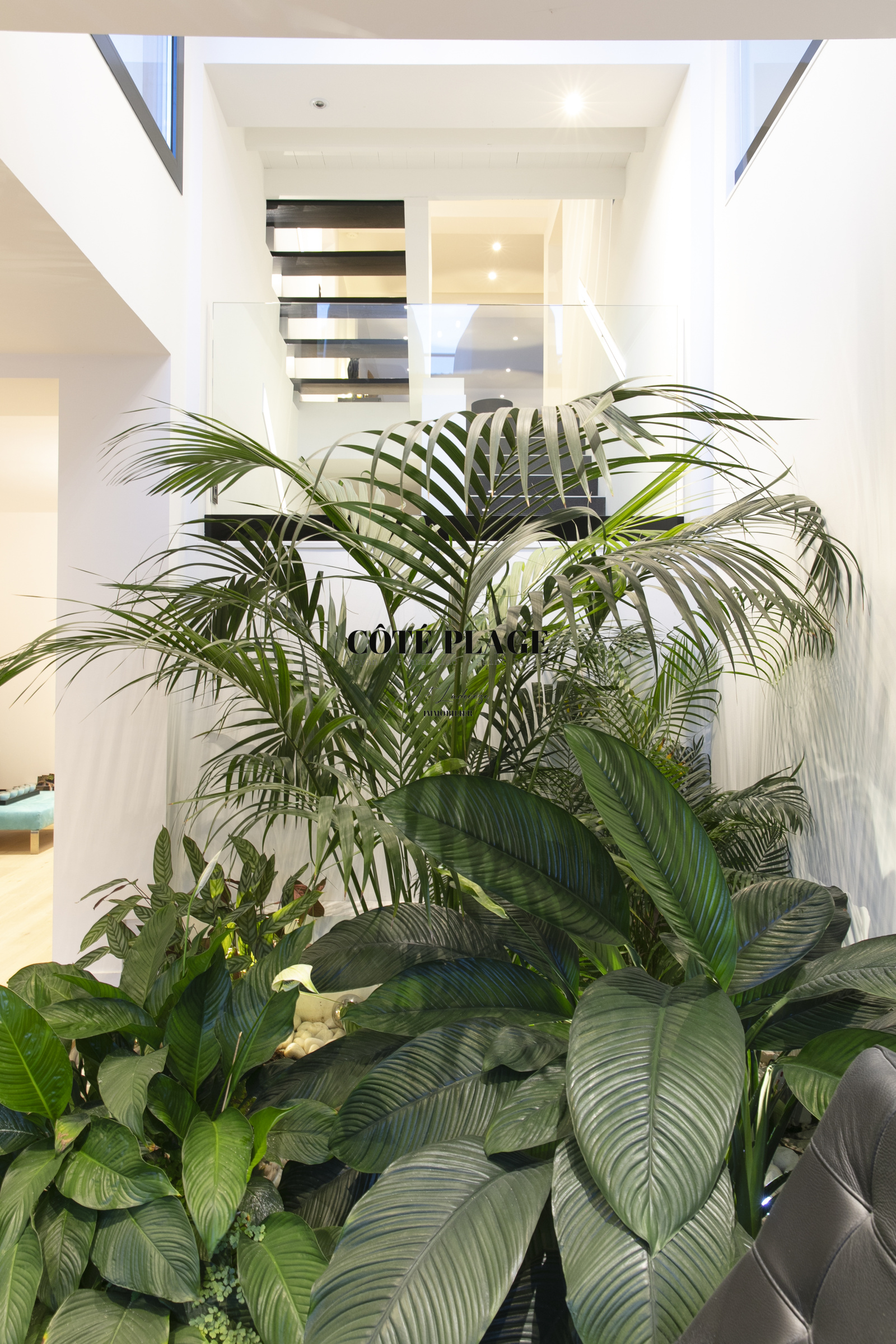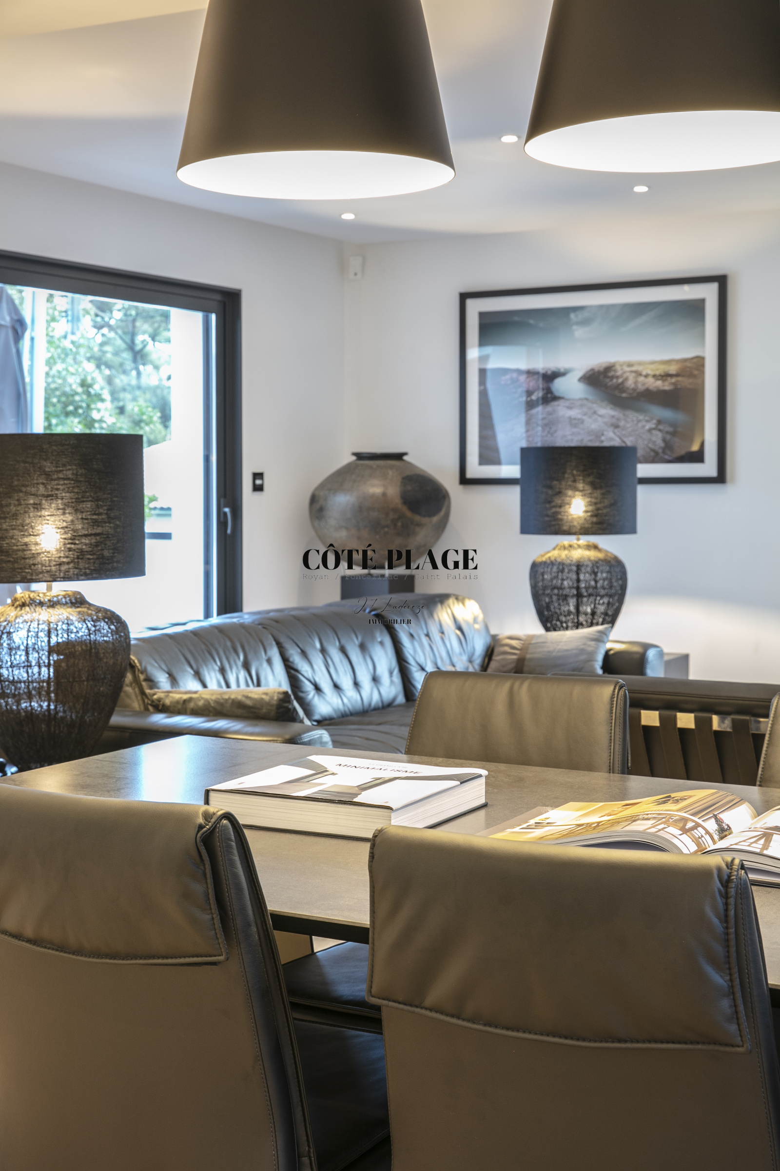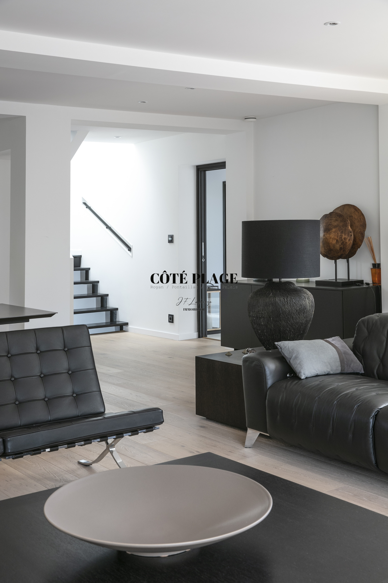 Au rez-de-chaussée, un deuxième salon, propice à la détente et équipé d'une télévision, ainsi qu'un bureau et des espaces nuit, s'articulent autour d'un jardin intérieur. Vous y trouverez une suite parentale dotée d'un dressing et d'une salle d'eau privative, en plus de deux autres chambres qui partagent une salle d'eau et des toilettes indépendantes. Chaque chambre dispose d'un accès direct au jardin et/ou à une terrasse. Ce niveau est également complété par une buanderie et un garage double.