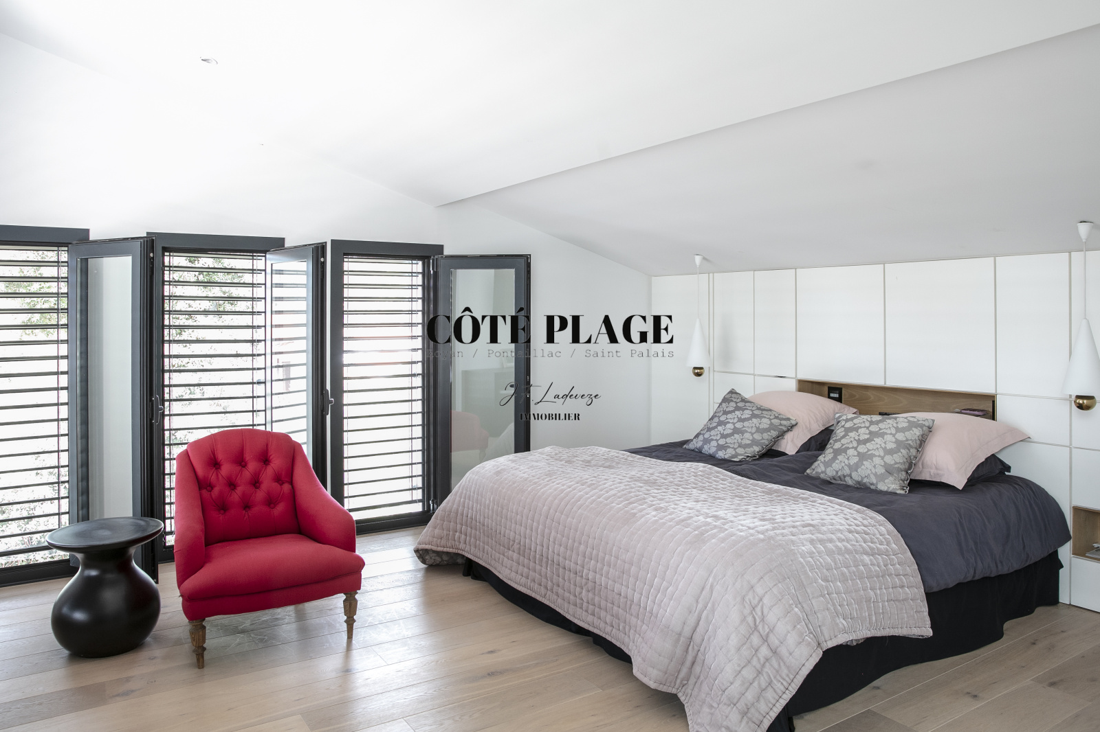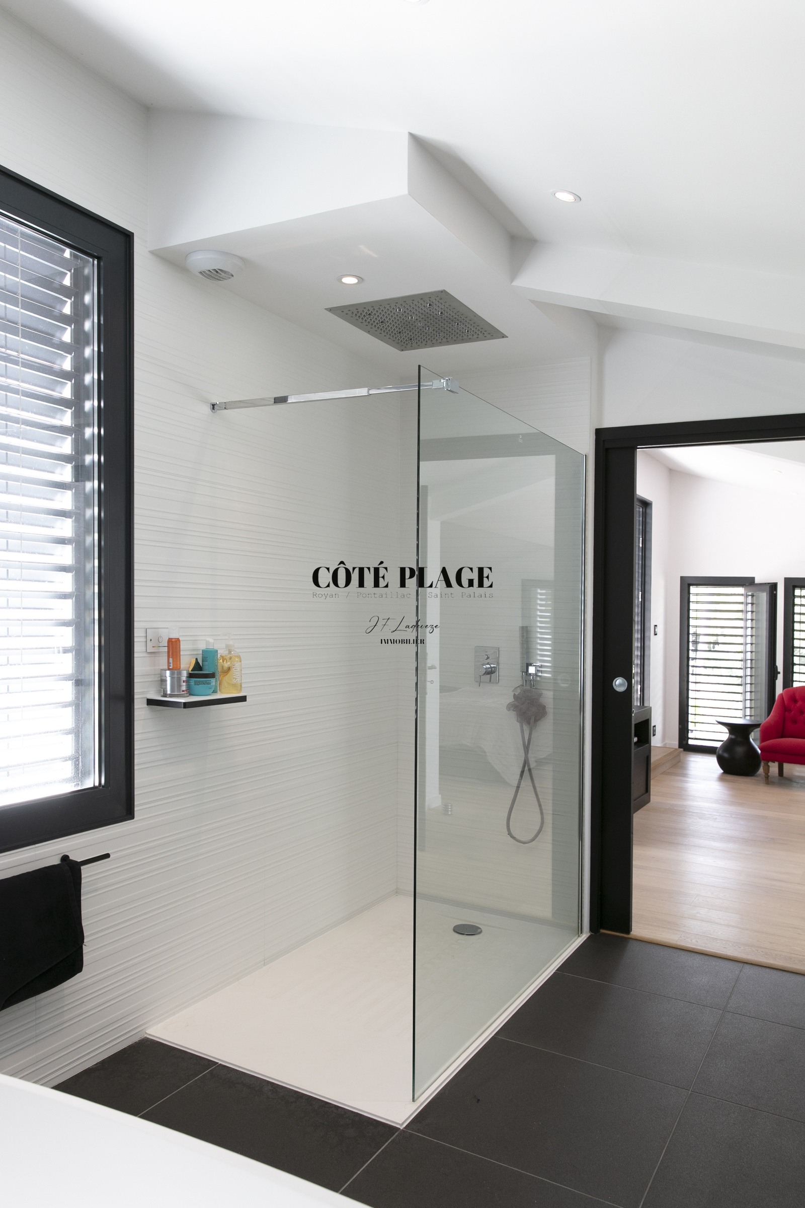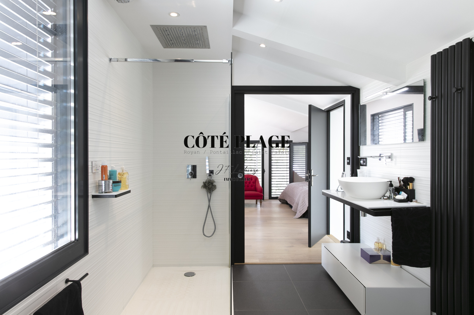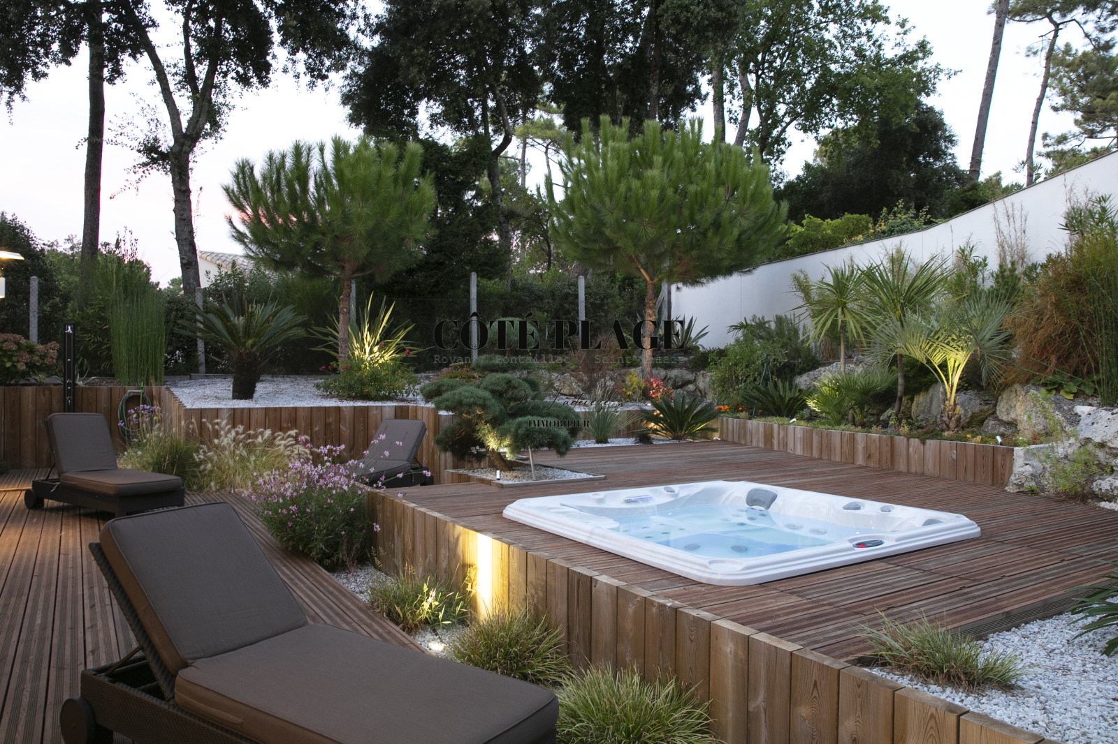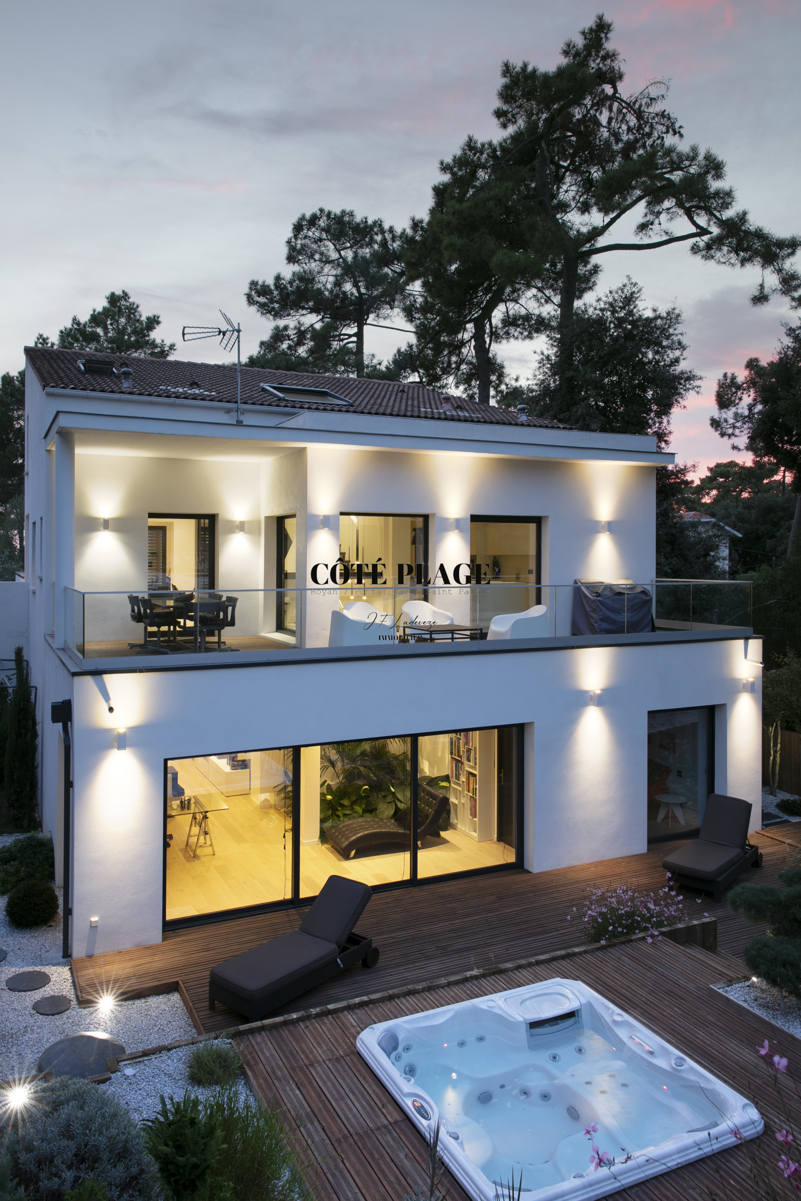L'étage supérieur est agrémenté d' une suite principale généreuse de près de 30 m², dotée d'une salle de bain élégante, d'un dressing spacieux et de nombreux rangements. Cette suite s'ouvre sur une terrasse à ciel ouvert de plus de 30 m², offrant une vue partielle sur la mer. En outre, le jardin a été méticuleusement aménagé pour établir des espaces harmonieux autour du jacuzzi et des terrasses, comprenant également un jardin en espalier.