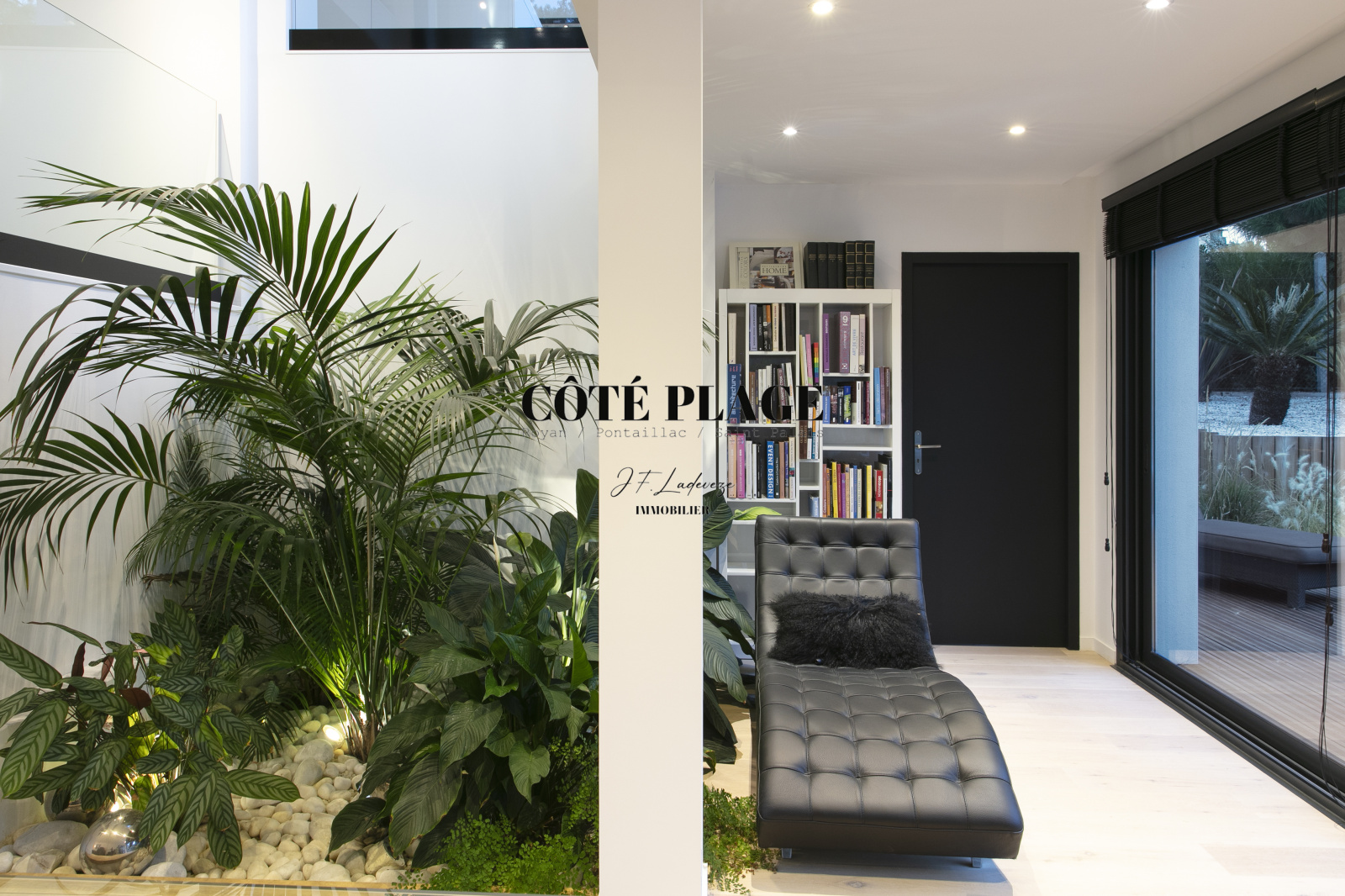 Au rez-de-chaussée, un deuxième salon, propice à la détente et équipé d'une télévision, ainsi qu'un bureau et des espaces nuit, s'articulent autour d'un jardin intérieur. Vous y trouverez une suite parentale dotée d'un dressing et d'une salle d'eau privative, en plus de deux autres chambres qui partagent une salle d'eau et des toilettes indépendantes. Chaque chambre dispose d'un accès direct au jardin et/ou à une terrasse. Ce niveau est également complété par une buanderie et un garage double.