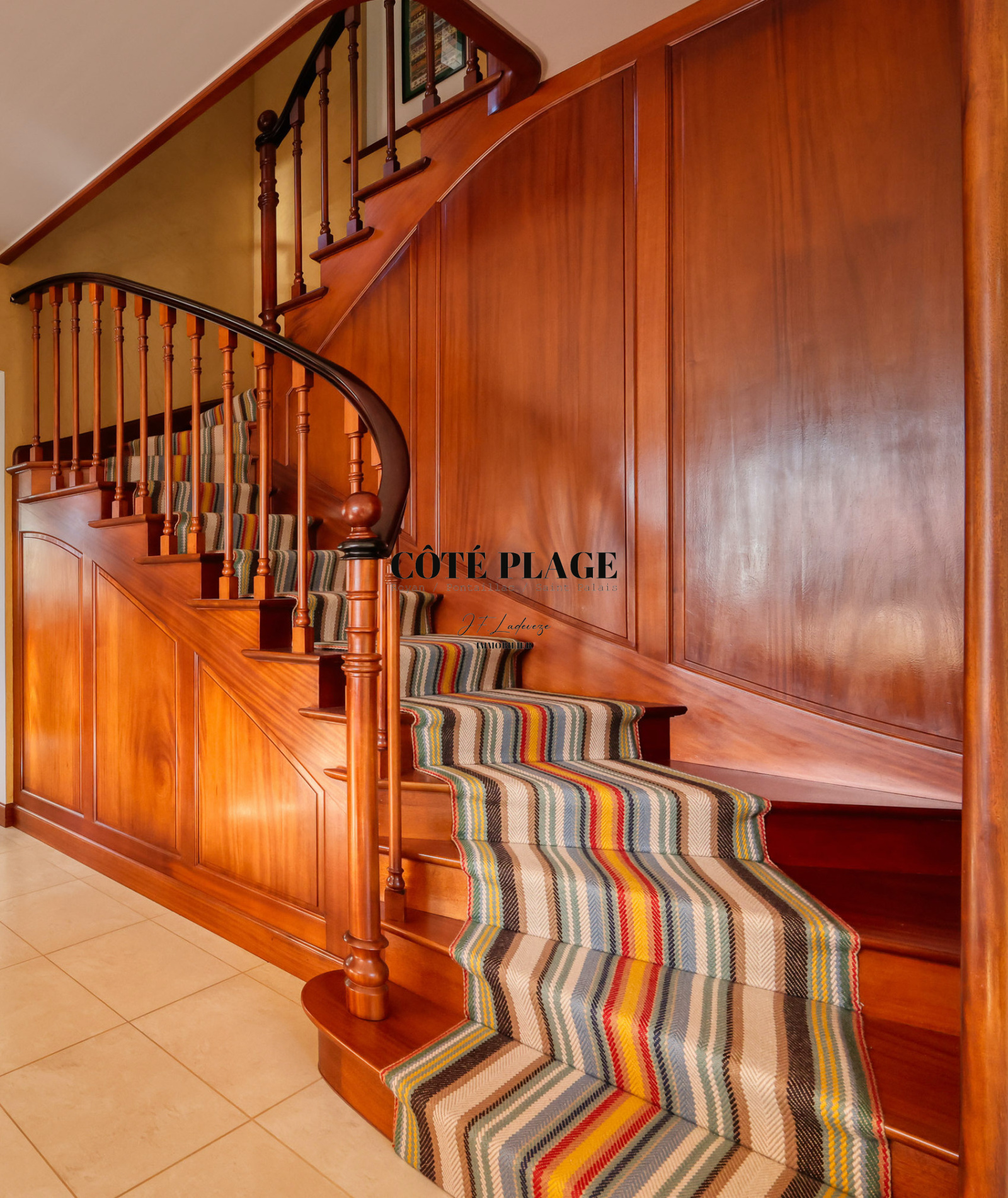 L'ensemble est agrémenté d une entrée, un salon avec cheminée, une salle à manger avec accès terrasse coté jardin , un cabinet de toilettes, une cuisine indépendante ouvrant sur terrasse avec aperçu océan - Les 3 chambres et salle de bains-douche à l étage sont accessibles par un magnifique escalier en bois d'acajou - un sous sol avec buanderie, chaufferie, garage spacieux - une dépendance dotée d' une jolie pièce à vivre très lumineuse, salle de bains , dressing, cabinet de toilettes complète la villa .