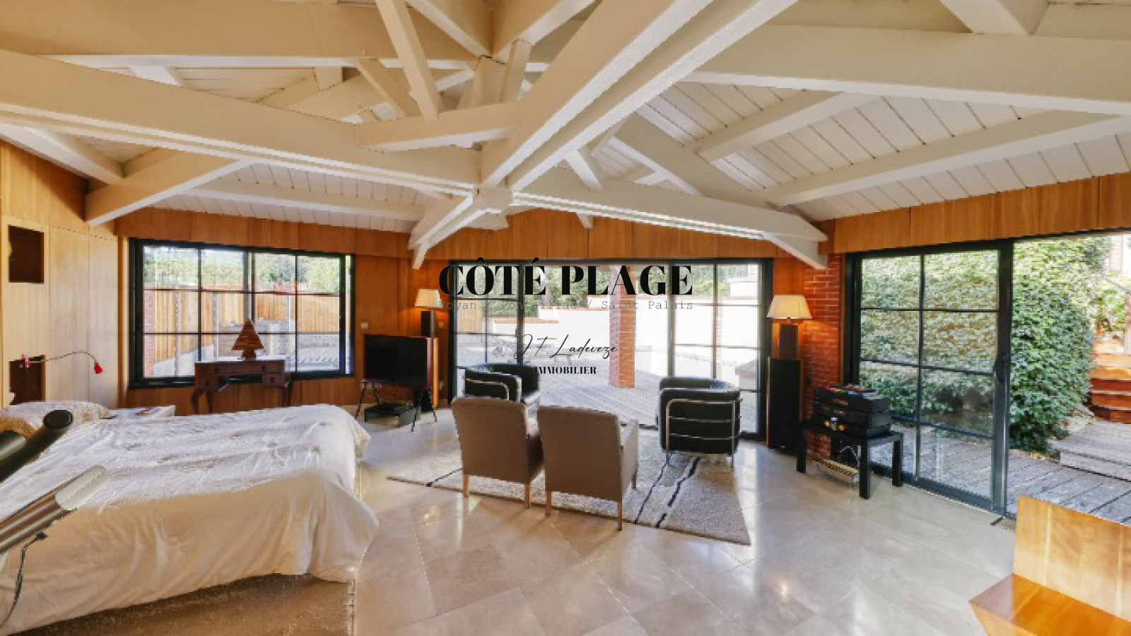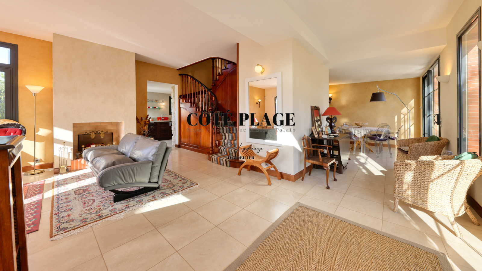 L'ensemble est agrémenté d une entrée, un salon avec cheminée, une salle à manger avec accès terrasse coté jardin , un cabinet de toilettes, une cuisine indépendante ouvrant sur terrasse avec aperçu océan - Les 3 chambres et salle de bains-douche à l étage sont accessibles par un magnifique escalier en bois d'acajou - un sous sol avec buanderie, chaufferie, garage spacieux - une dépendance dotée d' une jolie pièce à vivre très lumineuse, salle de bains , dressing, cabinet de toilettes complète la villa .
