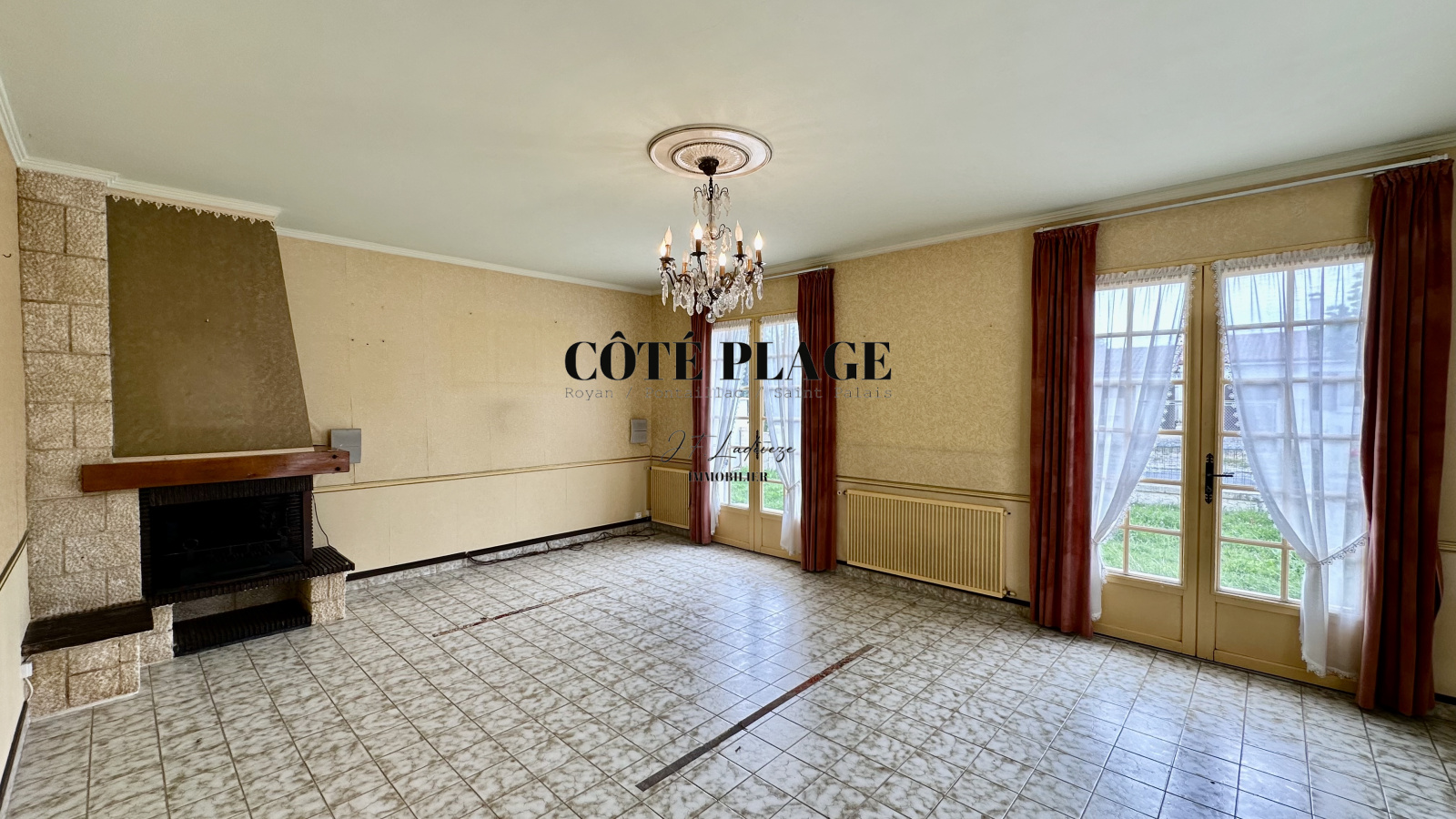cheminée, 2 portes fenêtres + 1 fenêtre