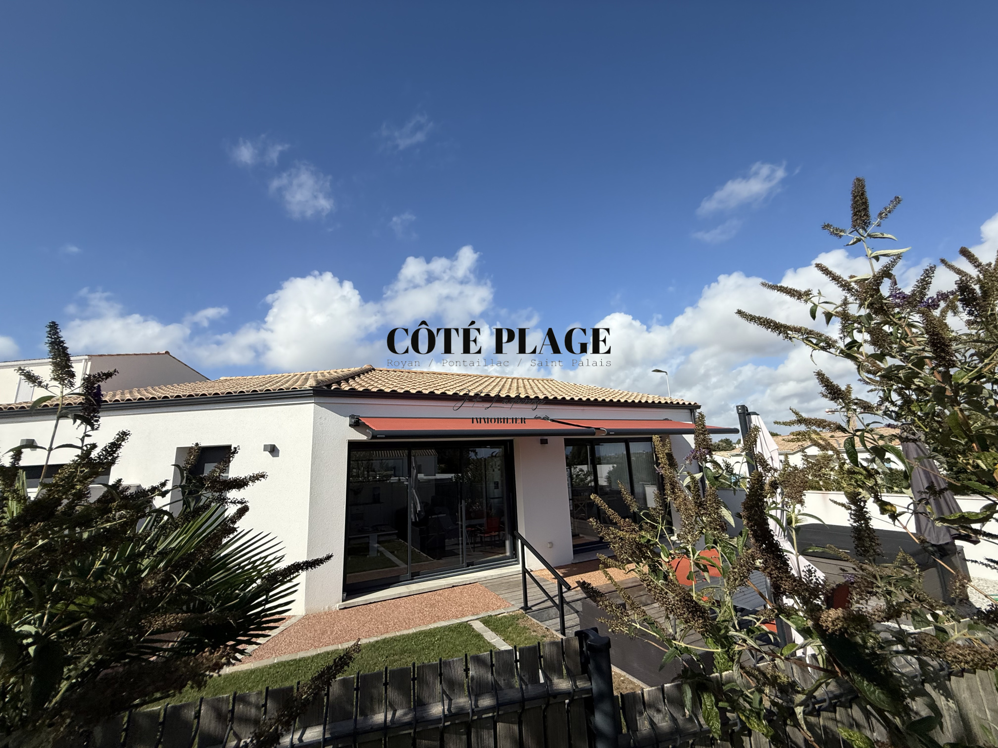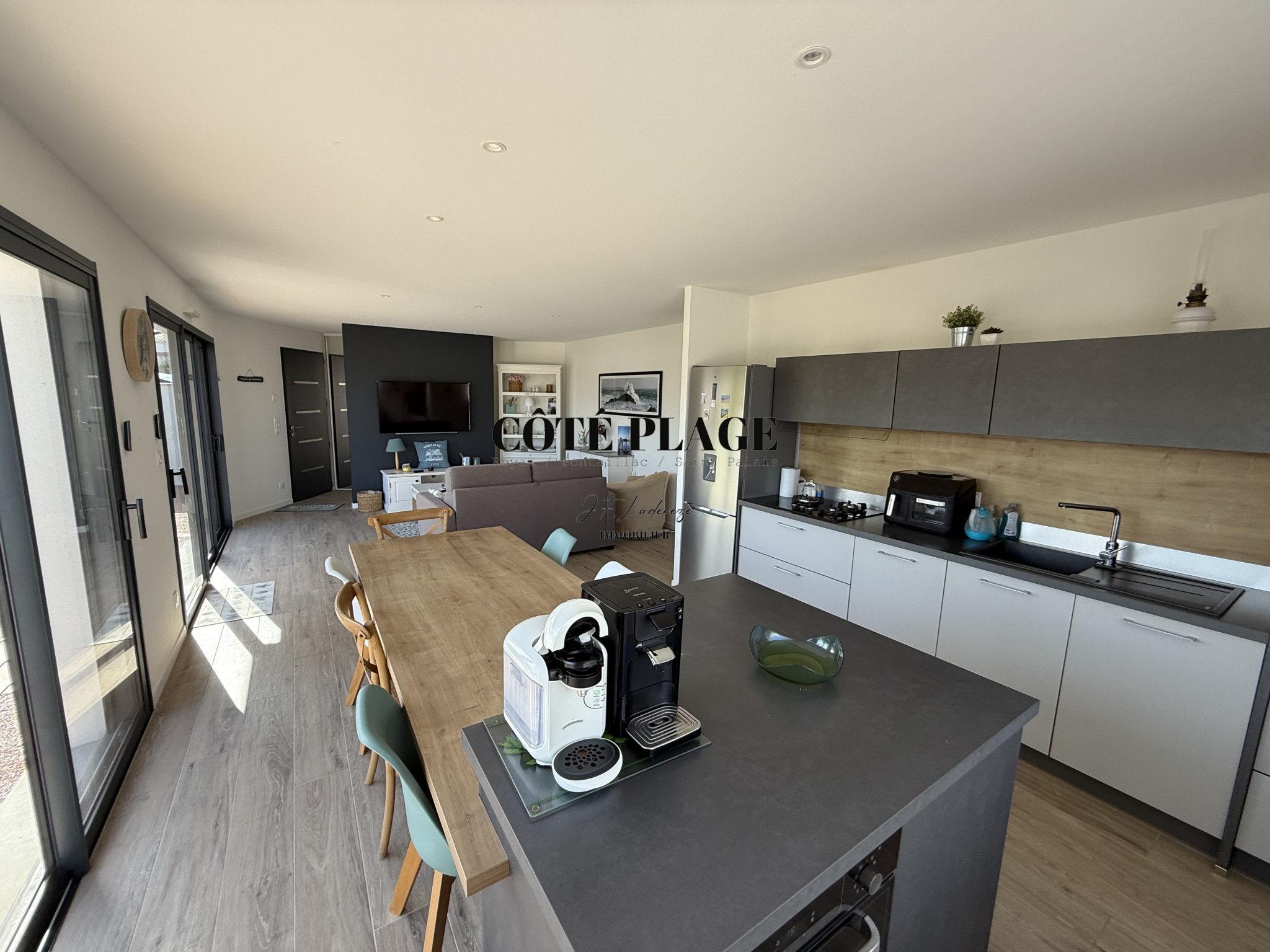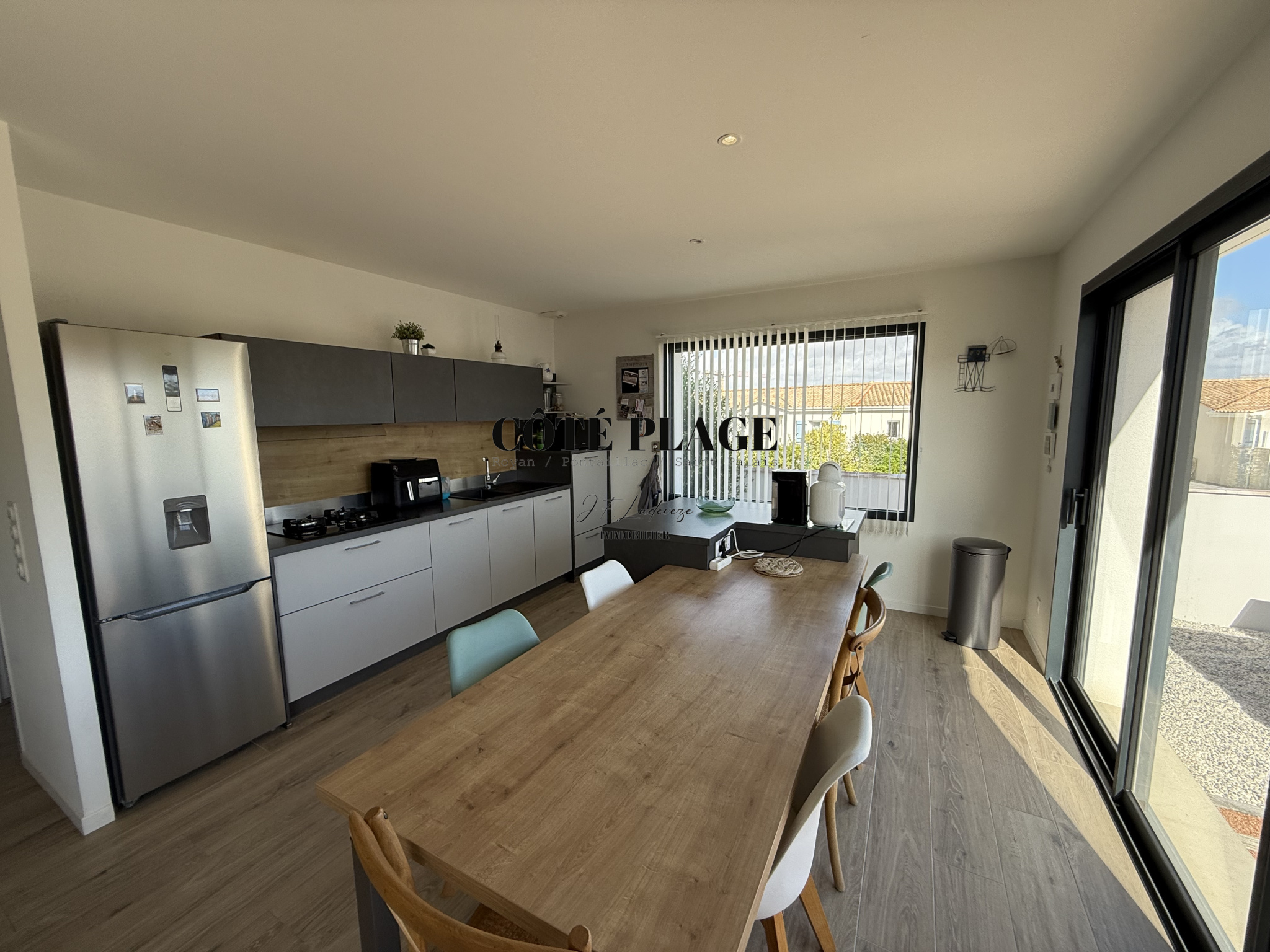 L'AGENCE CÔTÉ PLAGE IMMOBILIER vous propose à la vente une maison récente de 96 m² qui comprend une entrée avec rangement, belle pièce de vie lumineuse avec espace cuisine ilot donnant sur la terasse exterieure, 3 chambres avec placards, salle d'eau, WC séparé, cellier. Garage de 24 m². Terrain clos et vegetalisé avec SPA de 357 m².