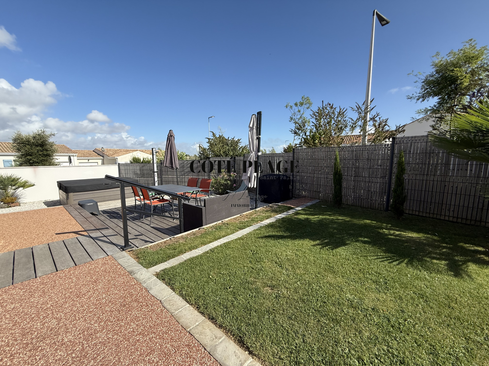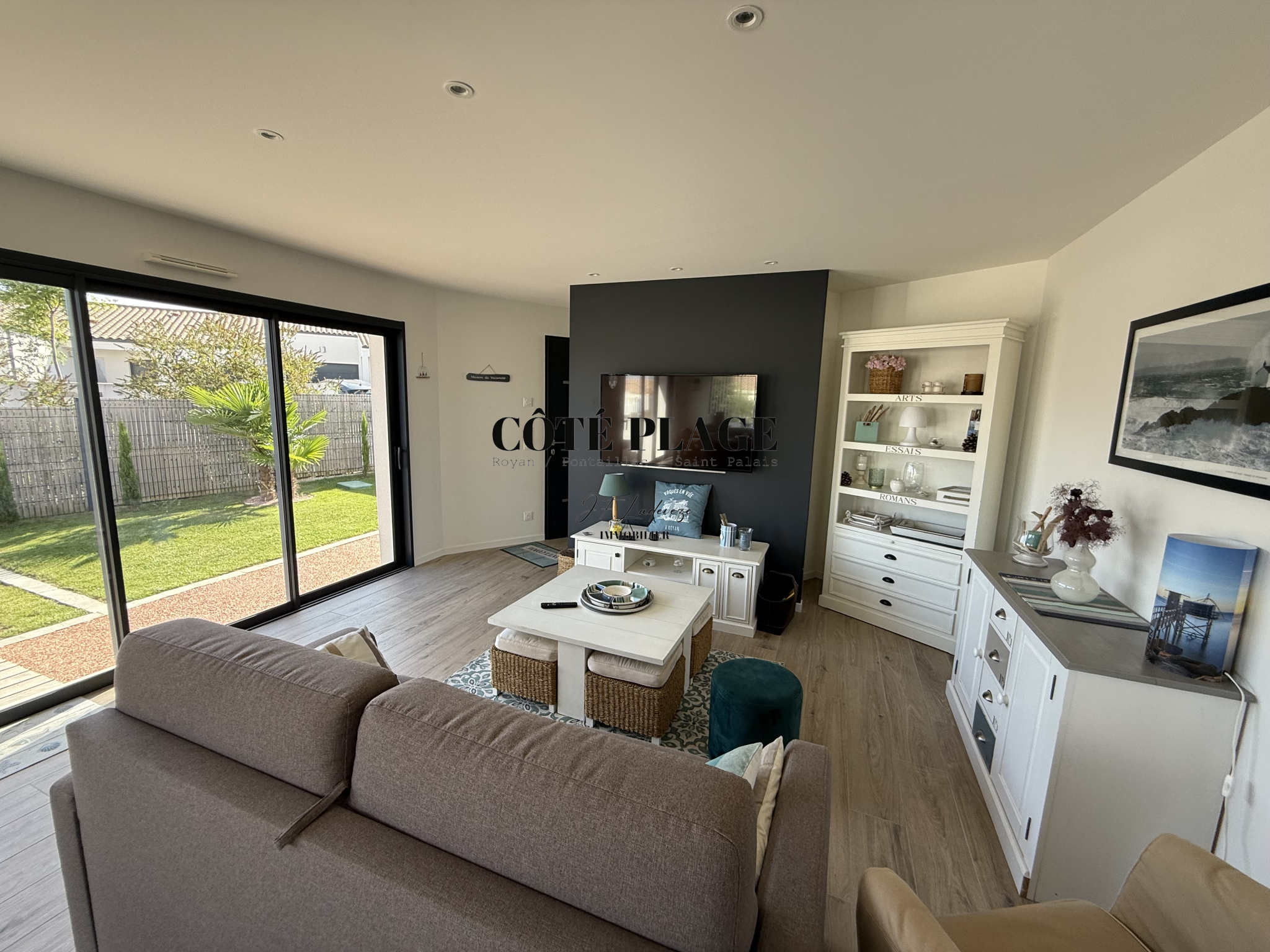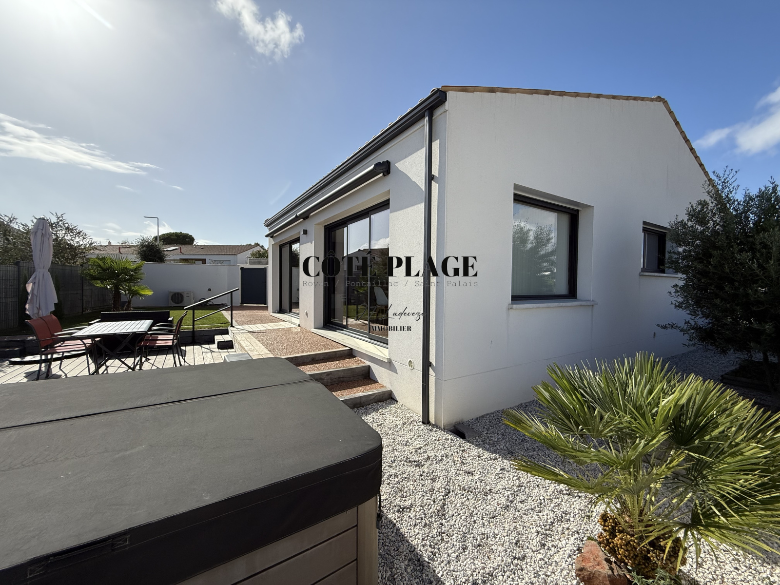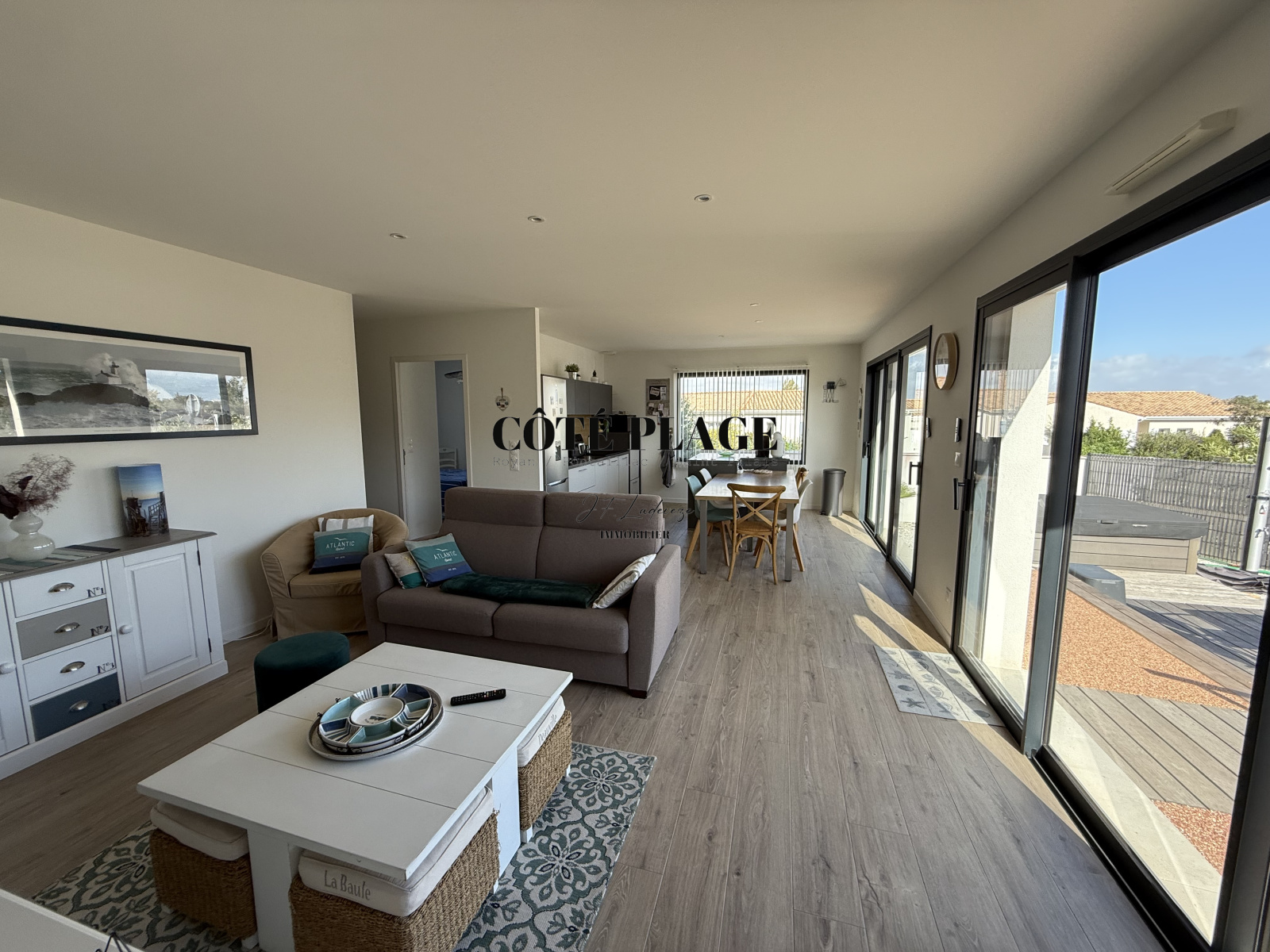 L'AGENCE CÔTÉ PLAGE IMMOBILIER vous propose à la vente une maison récente de 96 m² qui comprend une entrée avec rangement, belle pièce de vie lumineuse avec espace cuisine ilot donnant sur la terasse exterieure, 3 chambres avec placards, salle d'eau, WC séparé, cellier. Garage de 24 m². Terrain clos et vegetalisé avec SPA de 357 m².
