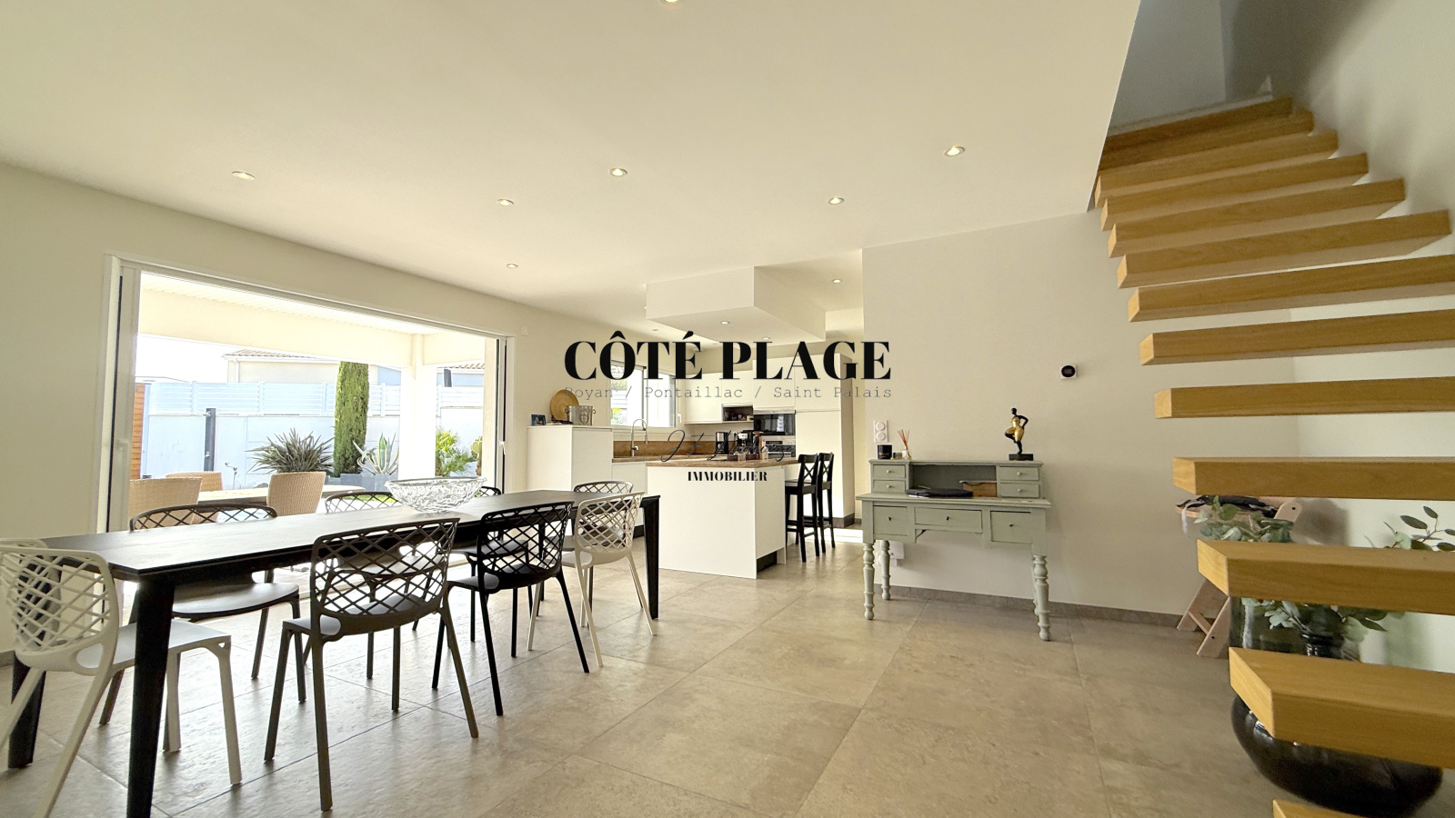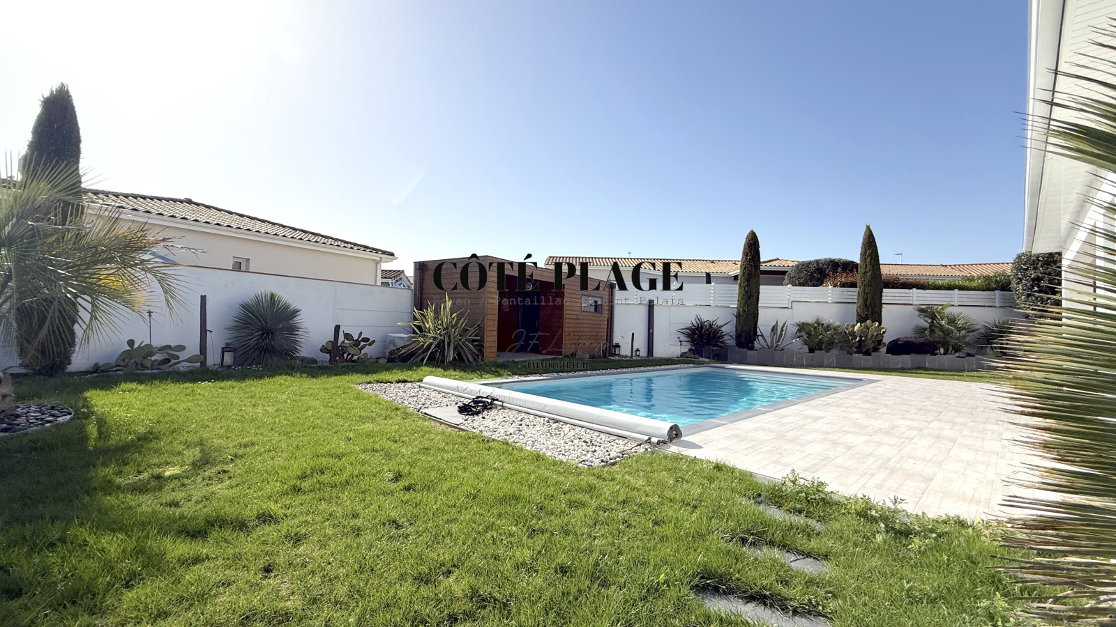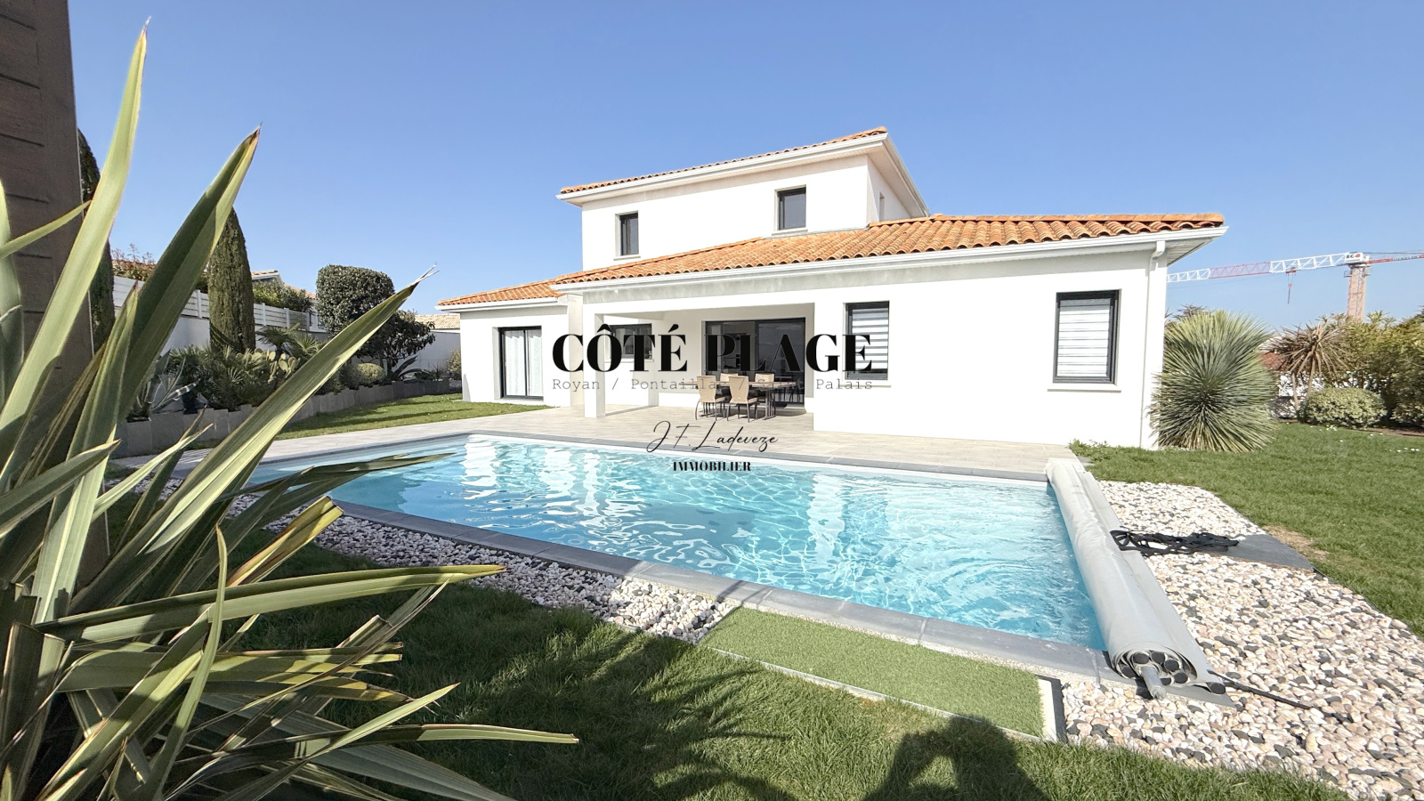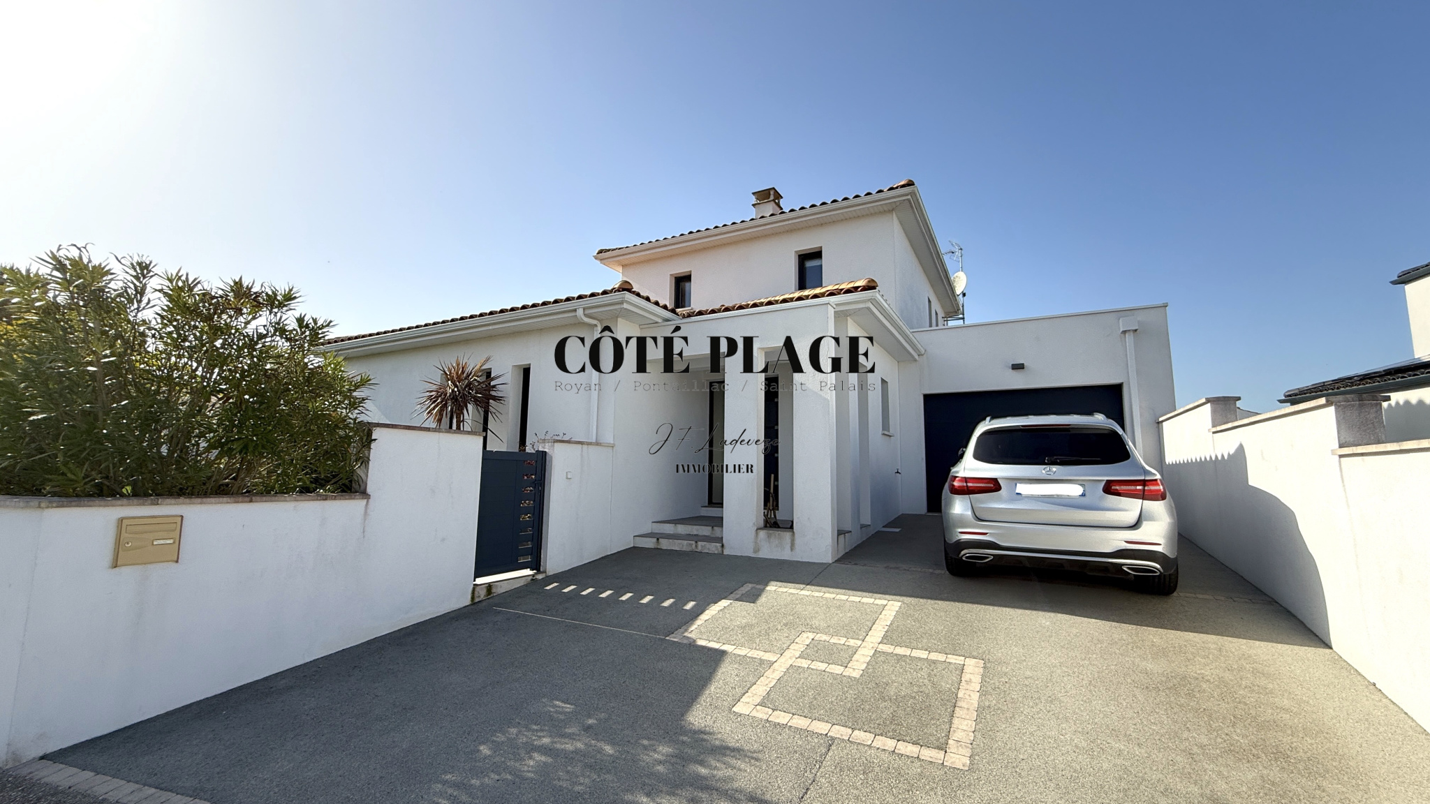 L'AGENCE CÔTÉ PLAGE IMMOBILIER PONTAILLAC vous propose à la vente une villa récente dans un quartier calme à 800 M du centre ville de VAUX SUR MER et 600 M des premiers commerces. Cette villa très lumineuse se compose d'une belle entrée avec rangement, pièce de vie ouverte avec cuisine donnant sur terrasse couverte et piscine. suite parentale avec dressing et salle d'eau. WC séparé,Arrière cuisine, garage. A l'étage : palier pouvant acceuillir un espace bureau au lit d'appoint. 2 chambres, salle d'eau. Pool-house. Jardin paysagé.