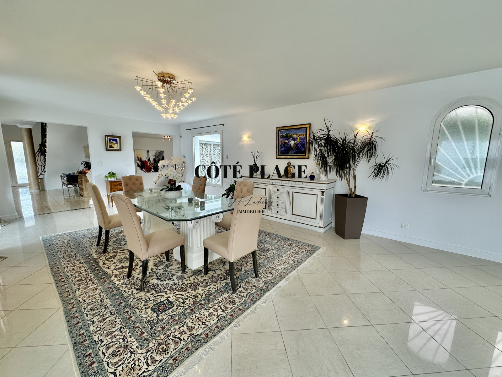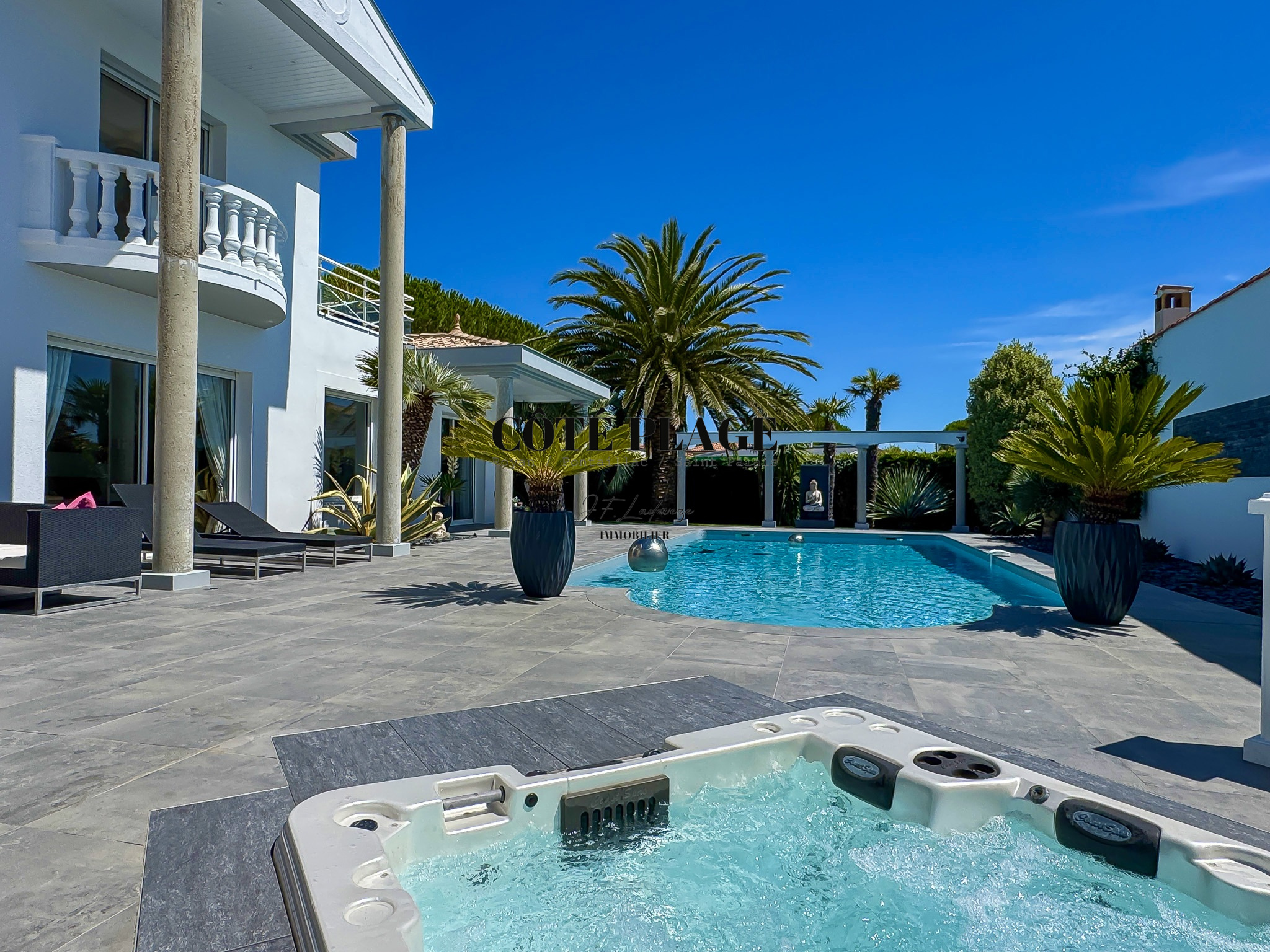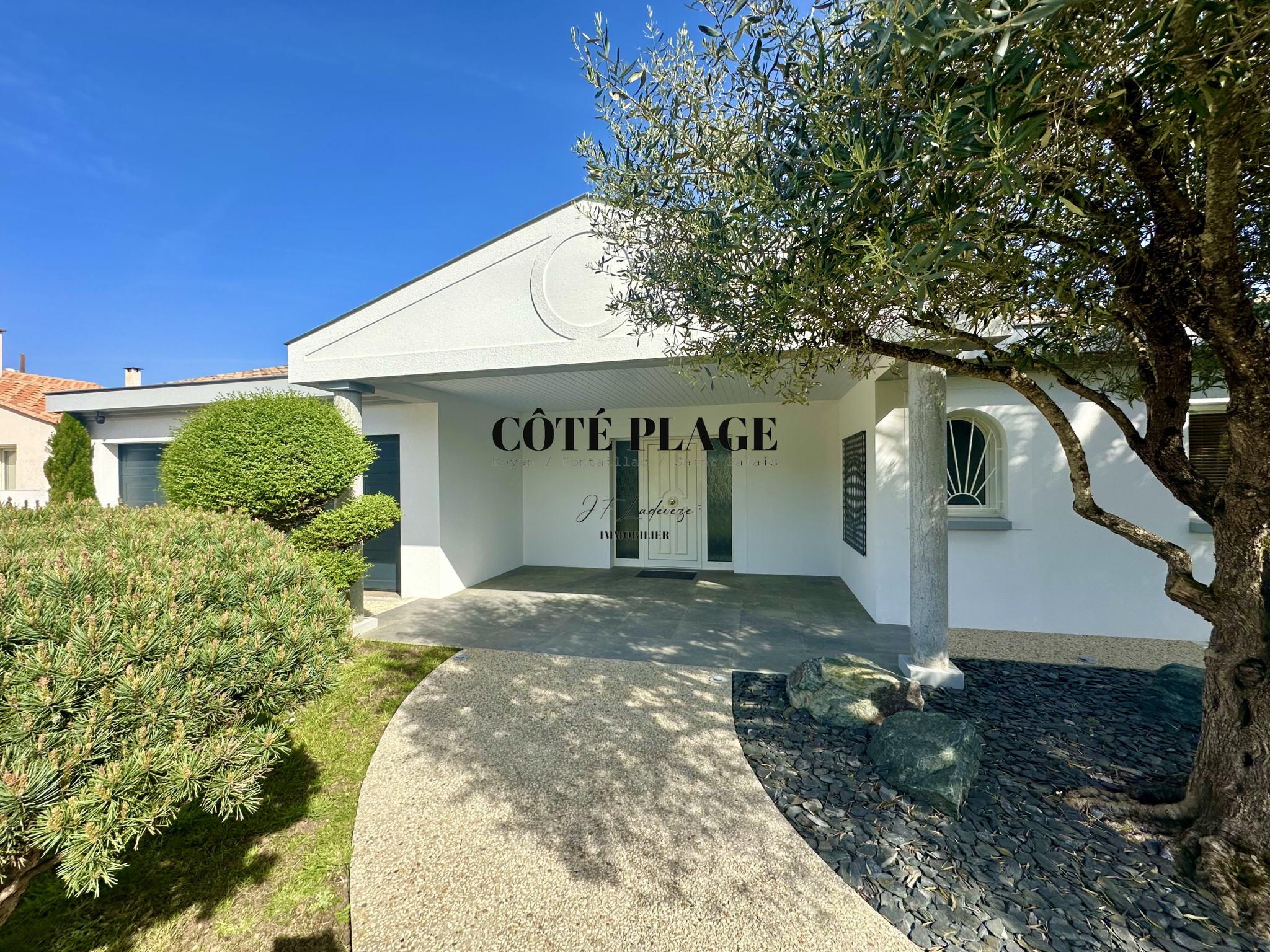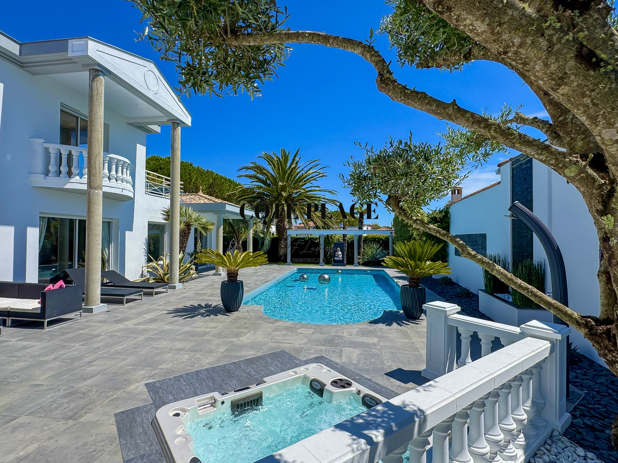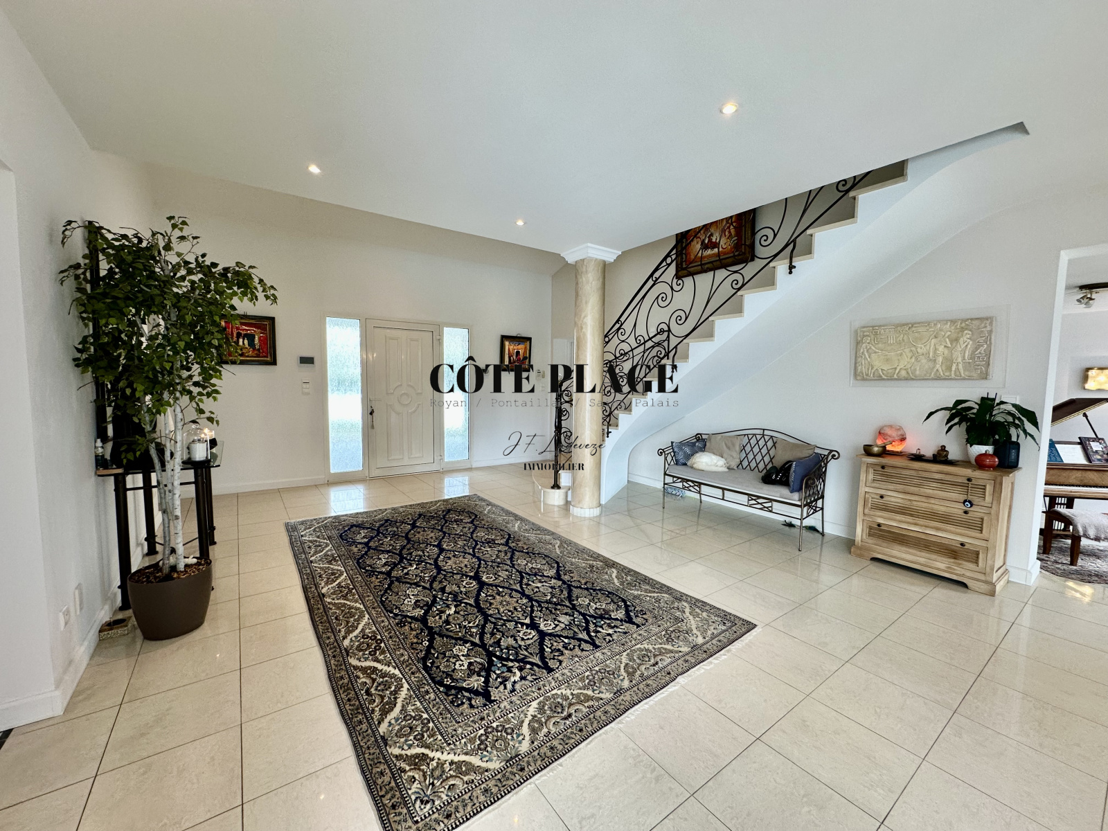 Côté Plage Immobilier Royan Pontaillac & Saint-Palais-sur-Mer vous propose à la vente cette somptueuse villa de 267 m² habitables, idéalement située sur la corniche de Vaux-sur-Mer, à seulement quelques pas de l’océan, au cœur d’un environnement résidentiel prisé et privilégié. Dès l’entrée, vous serez séduite par des volumes généreux et un agencement parfaitement optimisé. La maison avec piscine chauffée s’ouvre sur une élégante réception menant à une vaste pièce de vie baignée de lumière, en lien direct avec l’extérieur et la piscine. La cuisine, entièrement équipée et aménagée, est prolongée par une arrière-cuisine fonctionnelle offrant de nombreux rangements. Le rez-de-chaussée accueille également une chambre d’amis avec sa salle d’eau privative, ainsi qu’un espace bureau-bibliothèque (ou pièce musicale), ouvert sur la salle à manger. À l’étage, l’espace nuit propose une superbe suite parentale avec dressing aménagé et salle de bains. Une chambre avec balcon bénéficie d’une agréable vue sur l’océan, tandis que deux autres chambres s’ouvrent sur une magnifique terrasse avec vue mer, complétées par une salle d’eau. Un double garage ainsi qu’une salle de sport et de loisirs entièrement aménagée viennent parfaire les prestations de cette propriété.À l’extérieur, le jardin paysager de 954 m², entièrement clos, constitue un véritable havre de paix. La piscine et son spa, récemment rénovés, s’intègrent harmonieusement au cœur de larges terrasses et d’espaces lounge dédiés à la détente. La végétation méditerranéenne soigneusement sélectionnée apporte fraîcheur, intimité et élégance. À proximité immédiate des commodités, tout en étant à l’abri des regards, cette villa d’exception séduit par son architecture unique et ses prestations haut de gamme. Une adresse rare pour une qualité de vie alliant confort, sérénité et art de vivre en bord de l'océan.